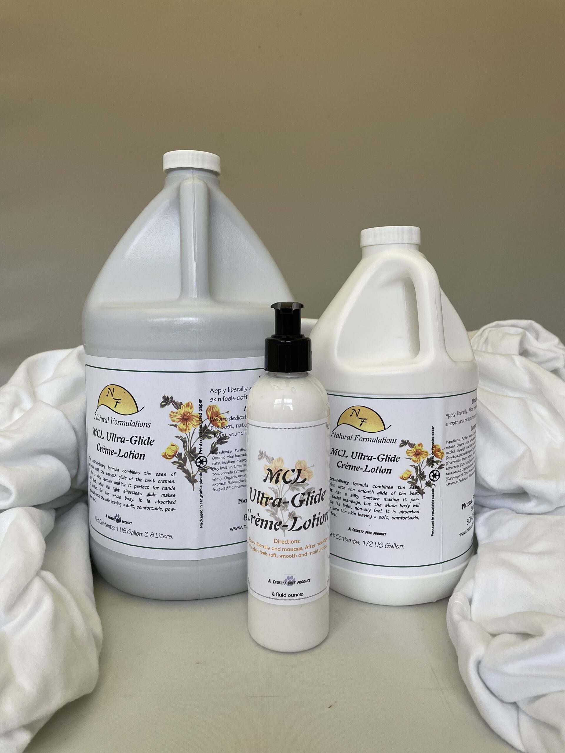 This satiny massage lotion melts onto the skin to provide a non-oily glide with enough grip to work the deeper muscles. It is formulated to minimize the chance of staining linens or cloths. A rich complex of natural botanical extracts condition and moisturize the skin during massage. A favorite with professional therapists.